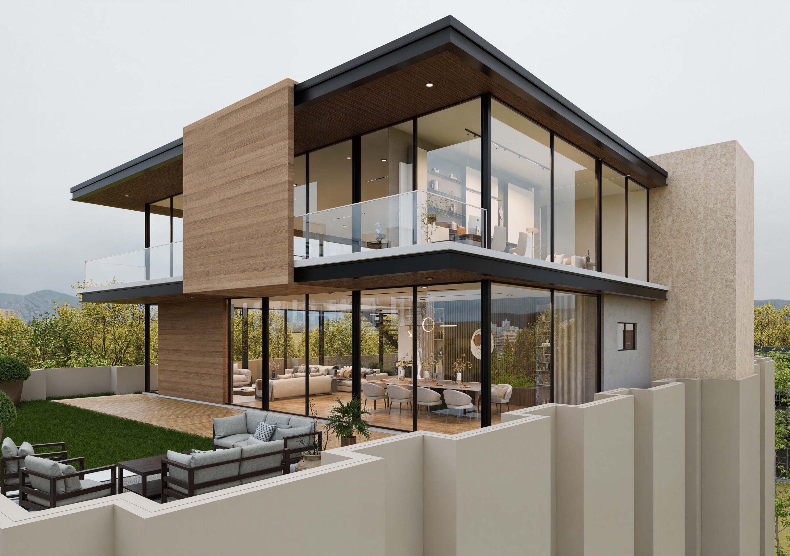 Au cœur de cette démarche se trouve la recherche d’un équilibre entre le minéral et le végétal. L’architecture cherche à créer une continuité entre intérieur et extérieur grâce à de larges baies vitrées qui prolongent les espaces de vie vers le jardin. Des patios et jardins intégrés viennent également structurer les espaces et renforcer cette relation permanente avec la nature. Sur le plan esthétique, la villa privilégie une palette de matériaux inspirés des éléments naturels. La pierre, le bois et des tonalités claires et apaisées sont utilisés pour créer une architecture douce, intemporelle et respectueuse de son environnement. Les textures et les finitions rappellent la nature et contribuent à une atmosphère chaleureuse et équilibrée.